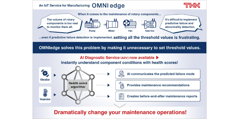 THK is now offering the brand-new AI Diagnostic Service (ADV), following the rotary component solution for its “OMNIedge” IoT service for the manufacturing industry.