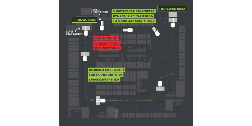 - The size of the safety field is adjusted to the load carrier type, thus optimizing paths and significantly reducing cycle times.