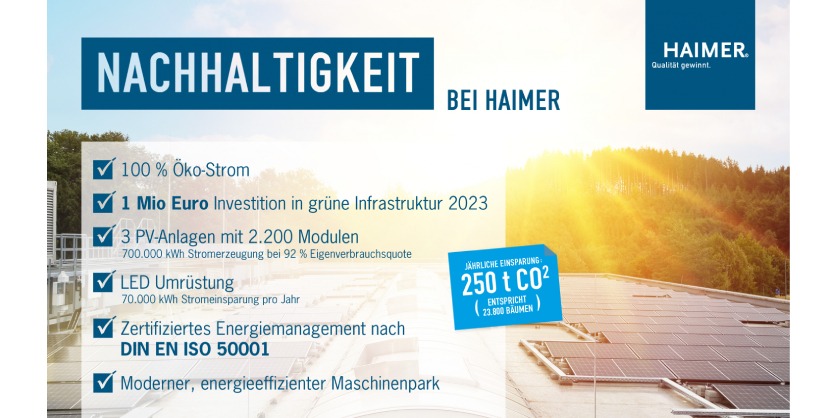 In 2023, HAIMER invested more than one Million Euros in green infrastructure. Among other things, the solar energy system was extended to other buildings and converted to LED lights. This will save more than 250 tons of CO2 per year.